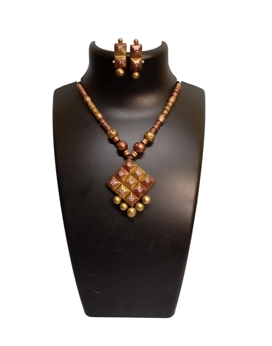This elegant piece of terracotta geomentric necklace set with matching earrings can be worn with traditional sarees, lehengas for special occasions. This will make you stand out in any crowd. Best gift for your loved ones.