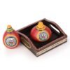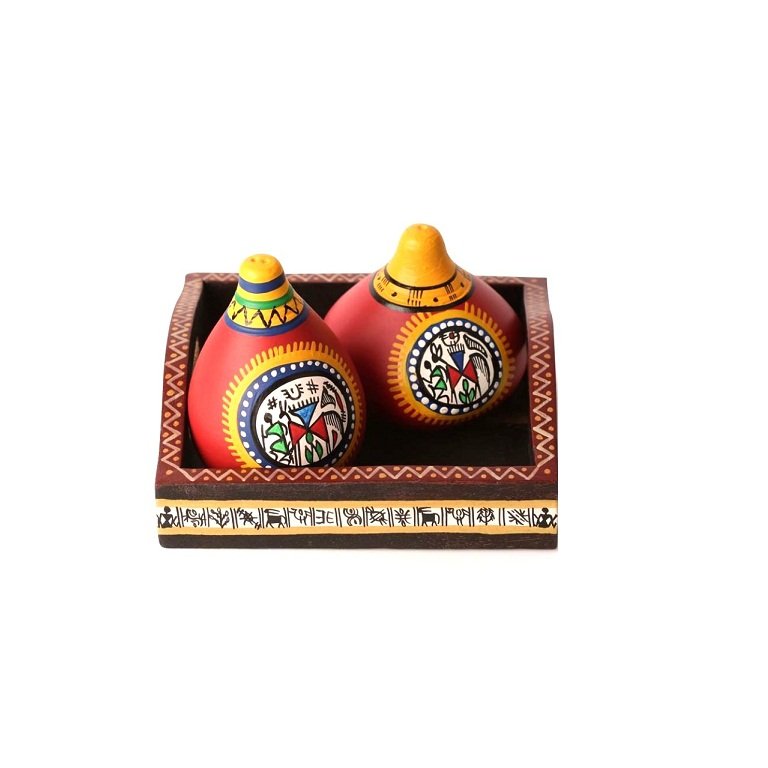 Adorn your dinner table with this stylish salt and pepper holder with a tray set. This set is handcrafted with terracotta and mango wood. The Warli hand-painted holders with tray give a perfect ethnic touch to your tableware. A good gifting option for house warming party.