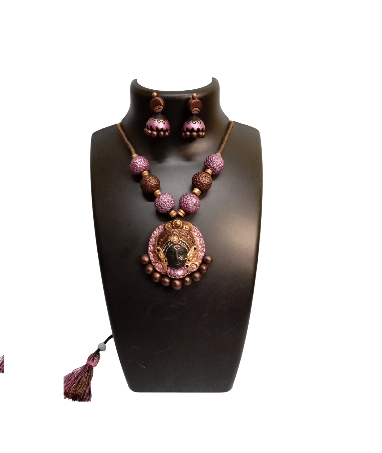This spectacular devi dollar terracotta designer pendant necklace set with matching jhumka earrings is suitable for traditional wear during special occasions and makes you stand out in the crowd. Best gift for loved ones.