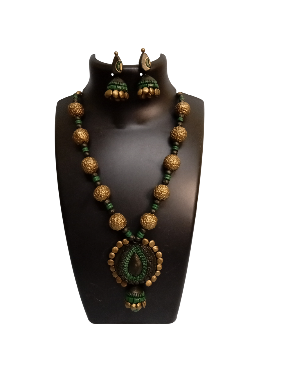 This elegant piece of terracotta designer pendant necklace set with matching earrings is suitable for traditional wear during special occasions and makes you stand out in the crowd. Best gift for loved ones.