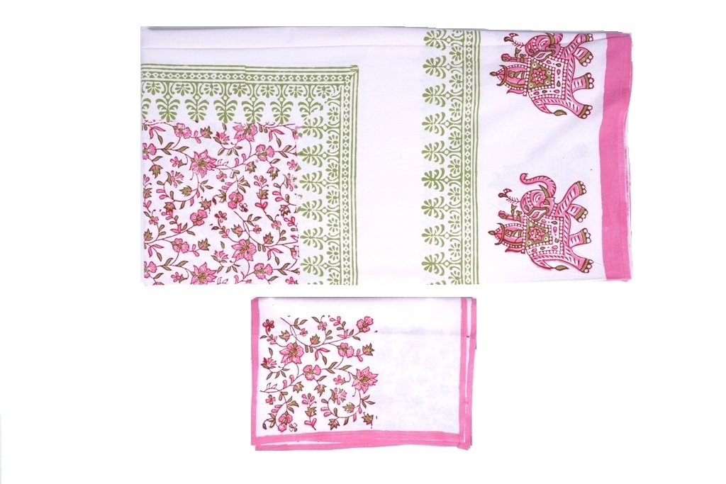 Indian hand block printed dining set comes with table cover and 6 napkins as a set. Bright colored and gives an ethnic touch to your dining corner.