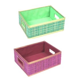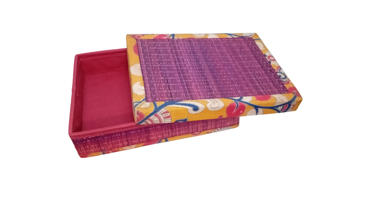 Trendy eco multipurpose square box with lid hand made from woven kora river grass with kalamkari border and non woven fabric lining. They are colorful and handy to store almost anything and everything( except eatable) . Also a fabulous gift for friends and family.