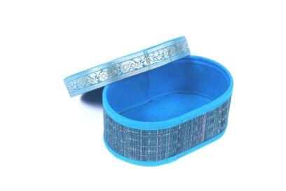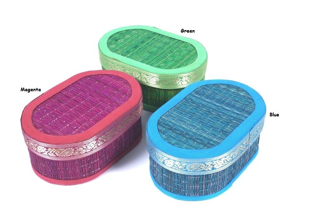 Trendy eco multipurpose oval box with lid hand made from woven kora river grass with zari border and non woven fabric lining. They are colorful and handy to store almost anything and everything( except eatable) . Also a fabulous gift for friends and family.