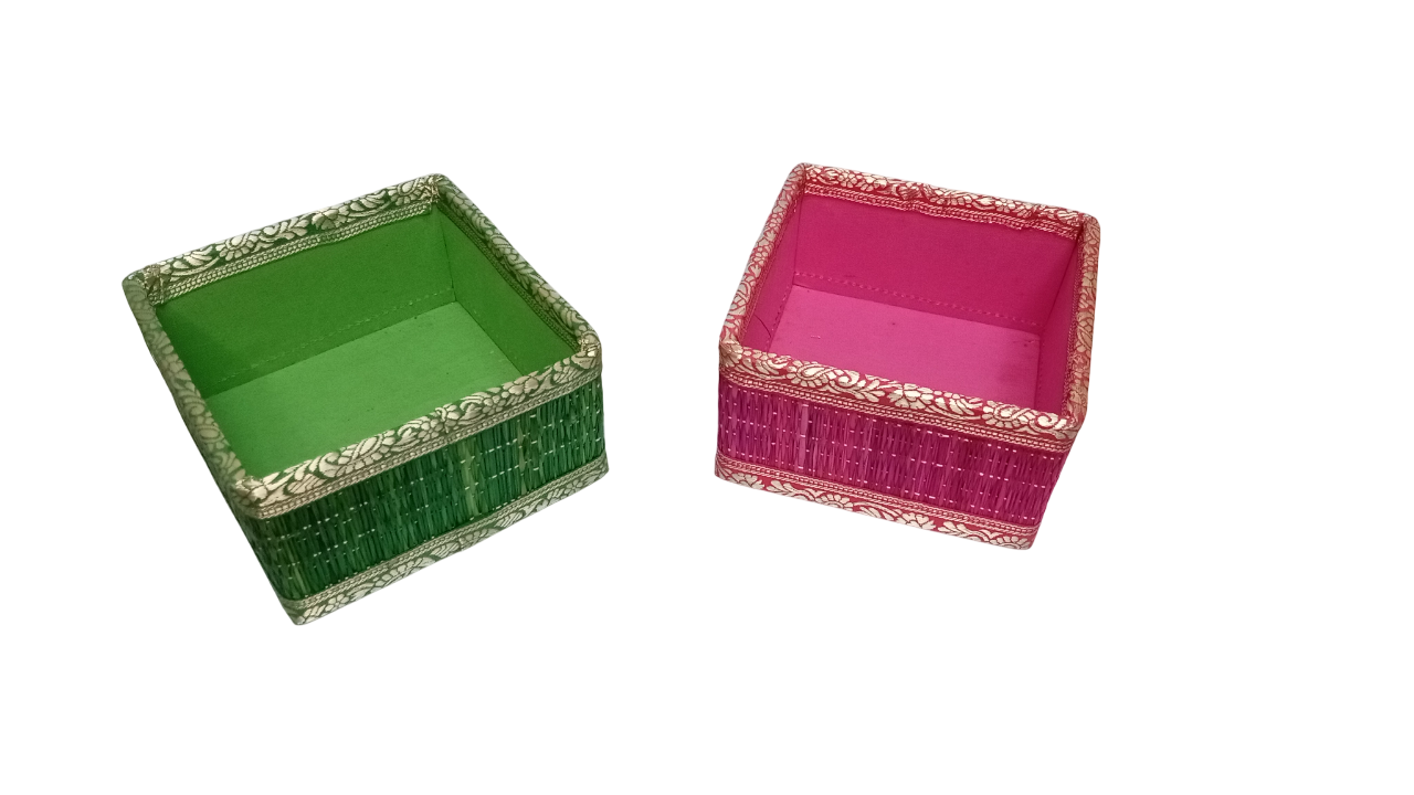 Trendy eco multipurpose stationery cum spoon holder made from woven kora river grass with zari border and non-woven fabric lining. They are colorful and handy in the office and kitchen. Also popular return gift for special occasions.