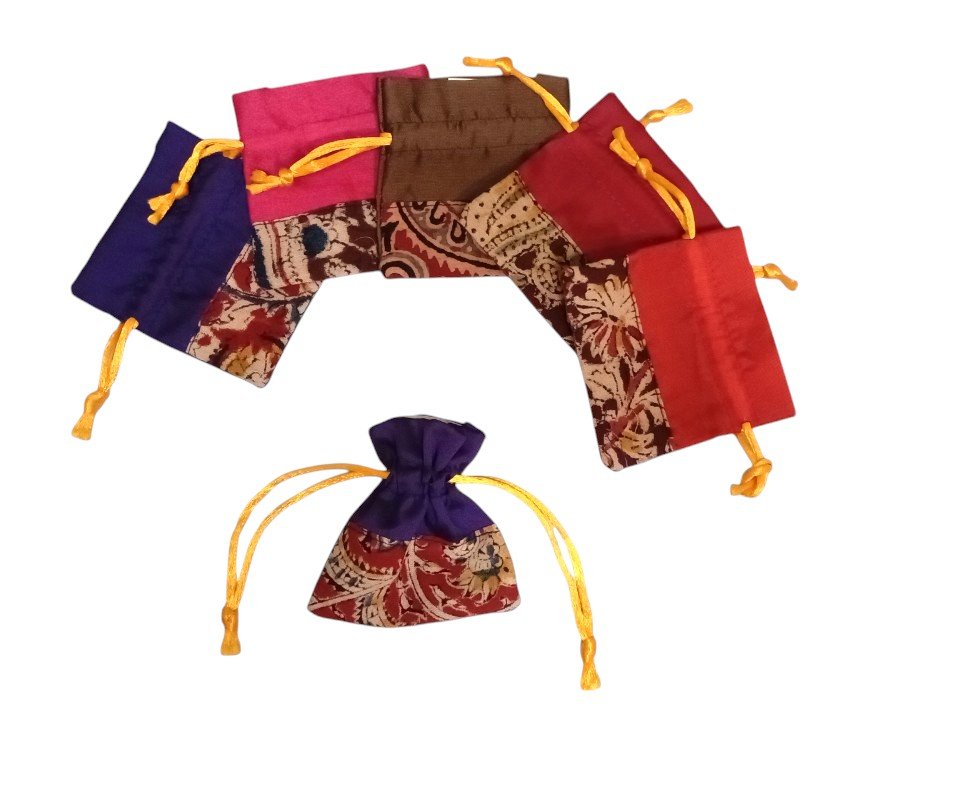 Stylish silk drawstring bag with kalamkari center patch. Lovely gift packing bag for weddings and other occasions. This mini-gift packing bag comes in a set of five and kalamkari patter will be assorted