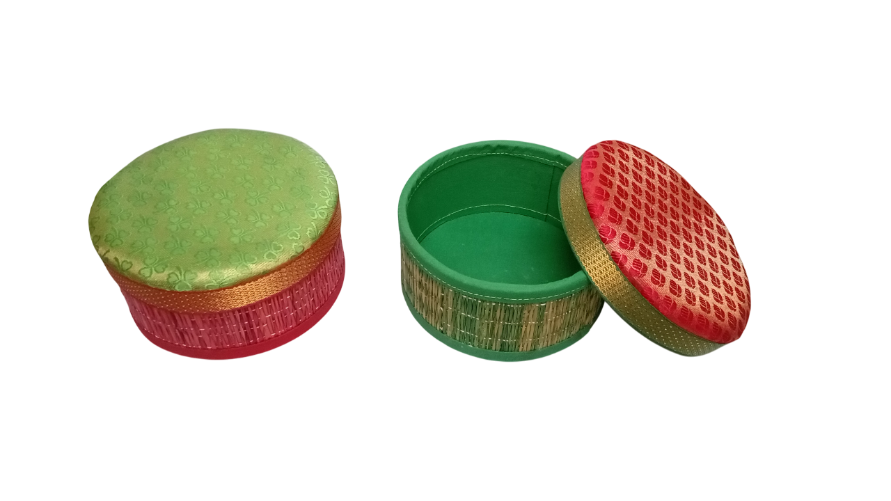 Trendy eco multipurpose round box with rich brocade fabric lid hand made from woven kora river grass with zari border and non-woven fabric lining. They are colorful and handy to store almost anything(except food). Also a fabulous gift for friends and family.