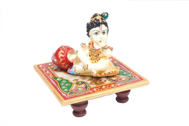 Gorgeous Bal Krishna statue seated on marble chowki, Made from high-quality of marble materials. Beautiful Bal Krishna statue with Makhan Matki adorned with fine hand painting work. Marble chowki is decorated with 2 peacock and Kalash designed also studded with Kundan white stones.