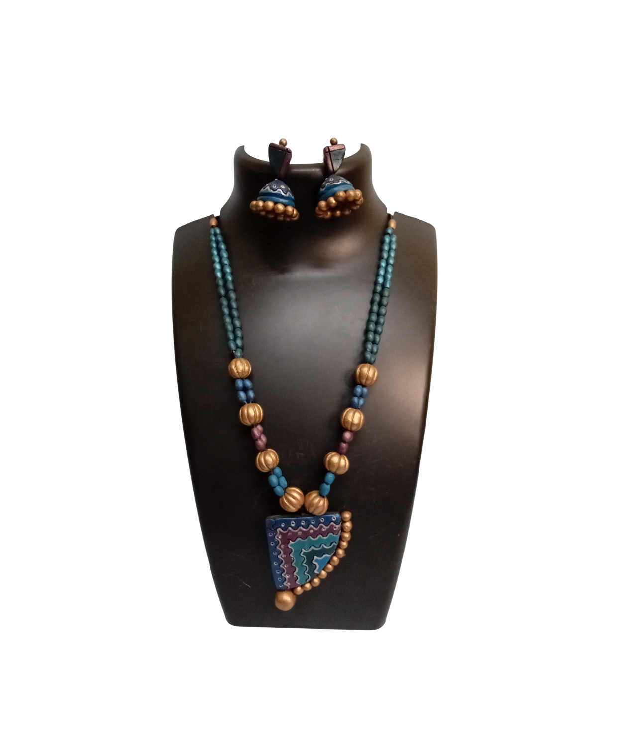 This trendy terracotta designer pendant necklace set with matching jhumka earrings is suitable for traditional wear during special occasions and makes you stand out in the crowd. Best gift for loved ones.