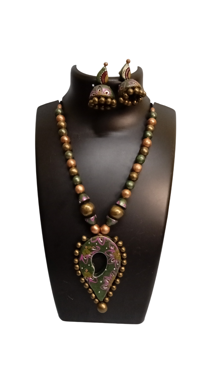This elegant piece of terracotta gold pendant necklace set with matching earrings can be worn with traditional sarees, lehengas for special occasions. This will make you stand out in any crowd. Best gift for your loved ones.