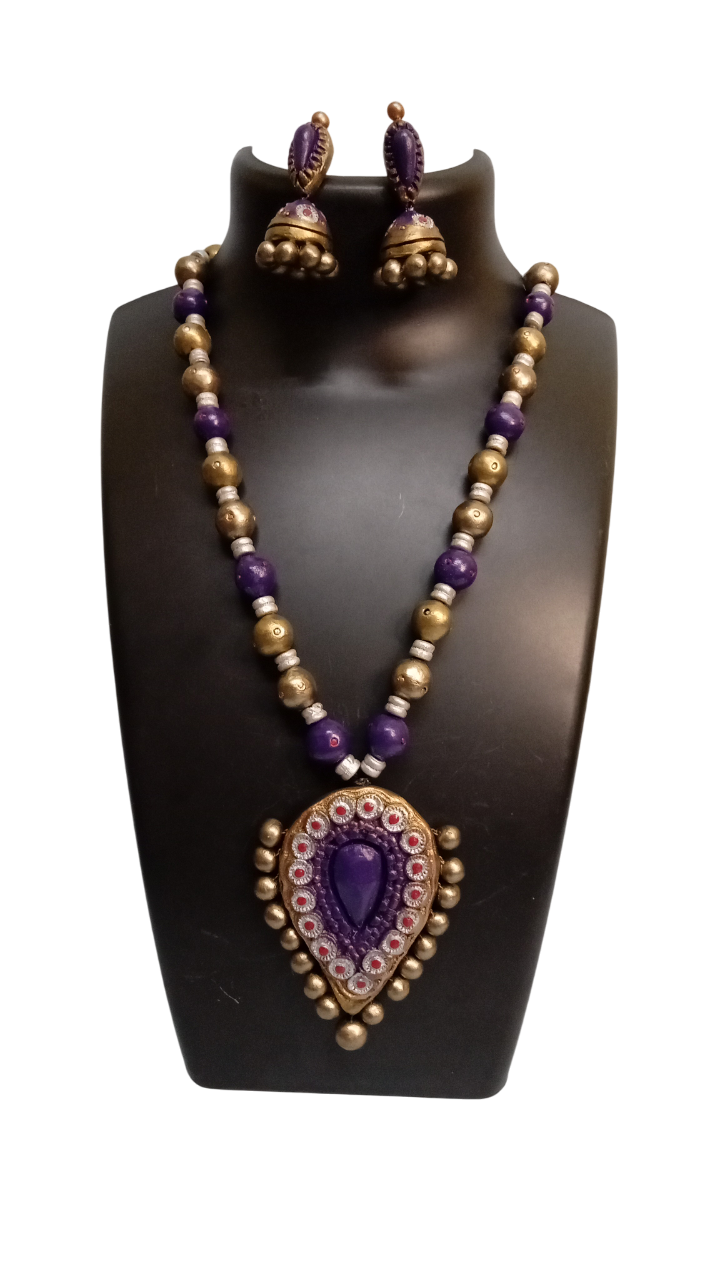 This elegant piece of terracotta gold pendant necklace set with matching earrings can be worn with traditional sarees, lehengas for special occasions. This will make you stand out in any crowd. Best gift for your loved ones.