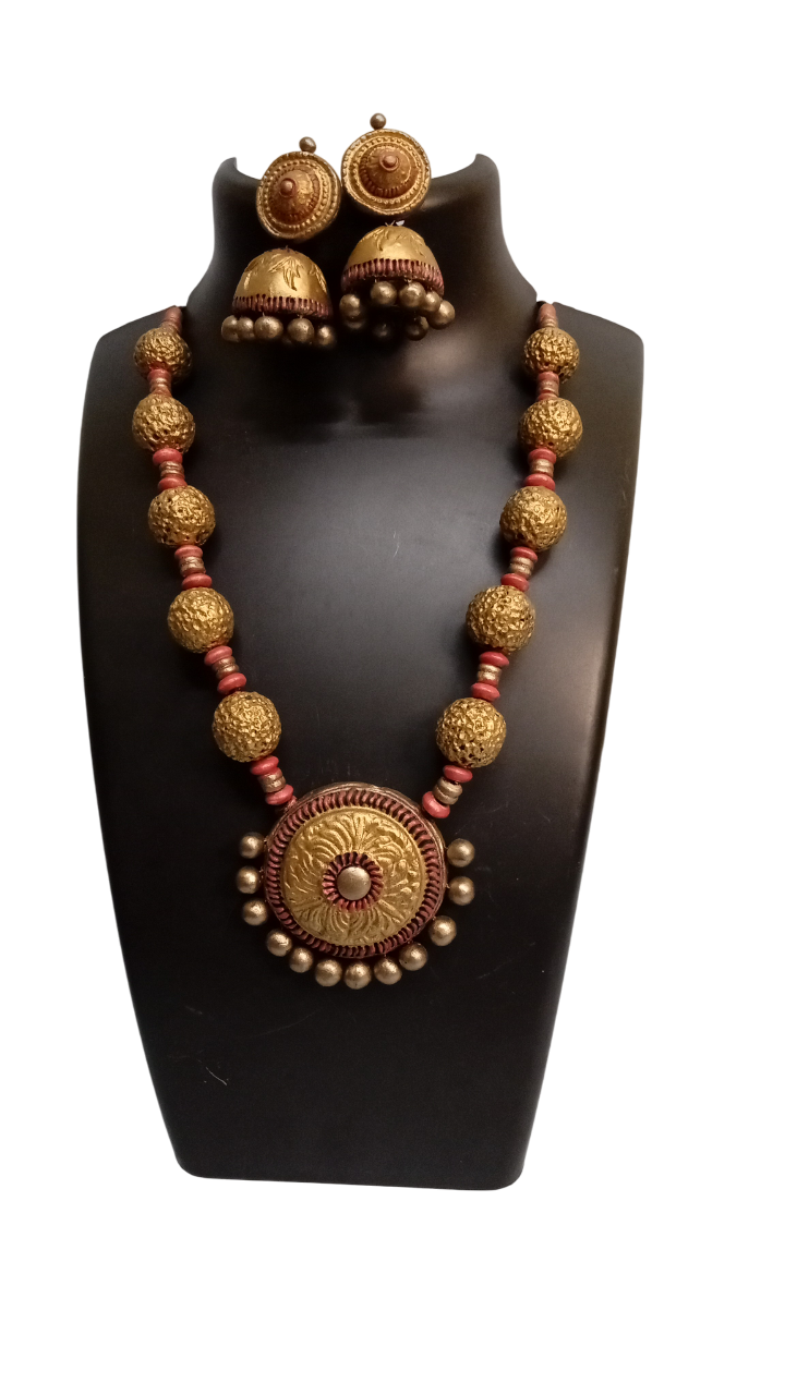 This elegant piece of terracotta round pendant necklace set with matching earrings can be worn with traditional sarees, lehengas for special occasions. This will make you stand out in any crowd. Best gift for your loved ones.