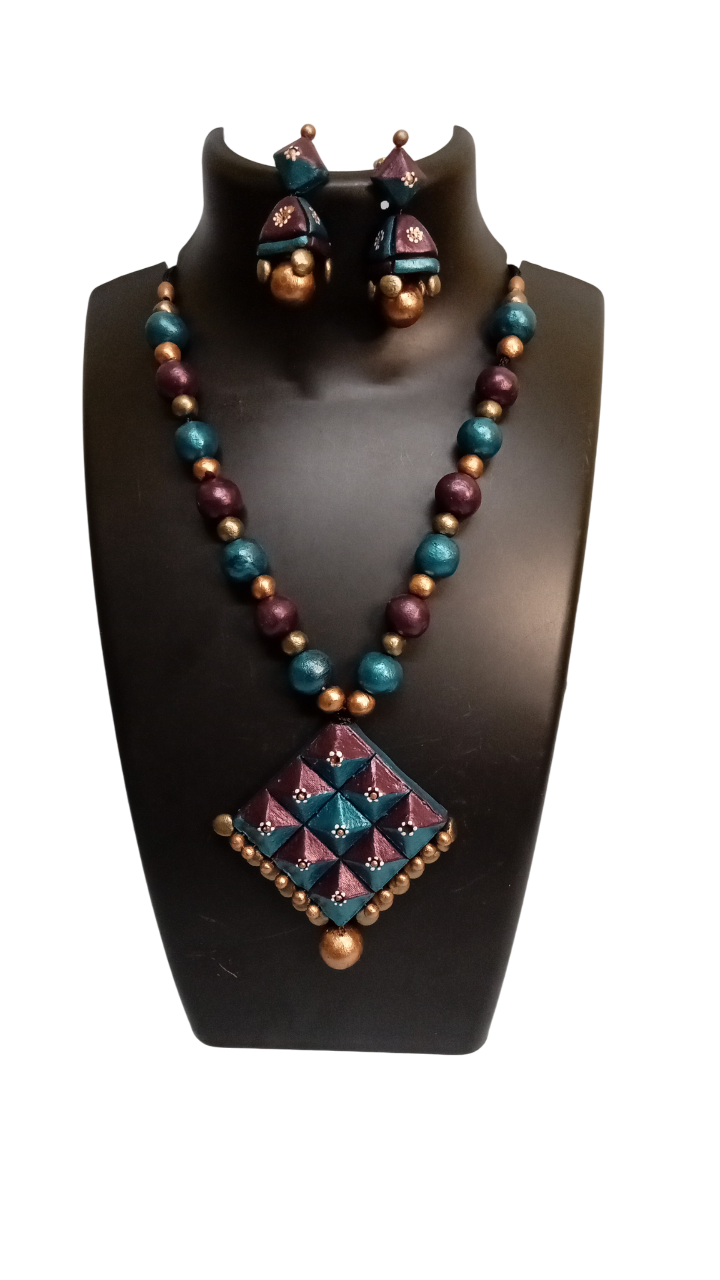 This elegant piece of terracotta square pendant necklace set with matching earrings can be worn with traditional sarees, lehengas for special occasions. This will make you stand out in any crowd. Best gift for your loved ones.